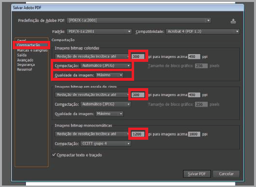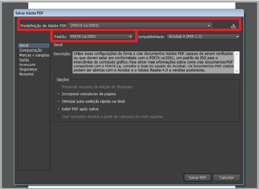 Nesta janela, selecione a “Predefinição de Adobe PDF" para "PDF/X-1a:2001"